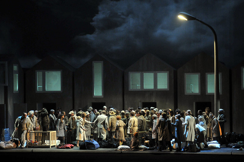 Ещё один спектакль Генриха Барановского под музыкальным руководством Теодора Курентзиса — упругая интерпретация музыки и то, что можно назвать осовремениванием спектакля. Причем осовременивание не беззубое, которое еле-еле практикует НОВАТ сейчас, а актуализация вкупе с проблематизацией. На сцене у режиссера вагоны, краны, видеоматериал и стробоскопы, миманс ходит в камуфляжных костюмах.