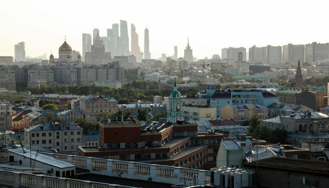 Широкая панорама на спортивный комплекс «Лужники», Москву-сити, Андреевский монастырь и изгиб реки. Открыточный вид, немноголюдная обстановка: можно неспешно рассмотреть все детали.