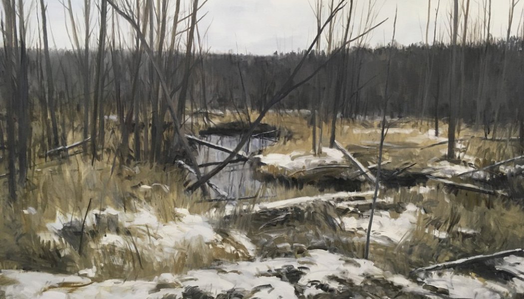 В прошлом году Егор Плотников показывал в Третьяковке выставку «Метагеография», а теперь продолжает пейзажную тему в «Триумфе» с серией реалистических среднерусских ландшафтов и миниатюрной скульптурой. Крупные новые холсты чередуются с маленькими фрагментами пейзажей, с одной стороны, играя с образом пространства и выставочного зала, а с другой — продолжая двухсотлетнюю монотонную традицию русской школы.
