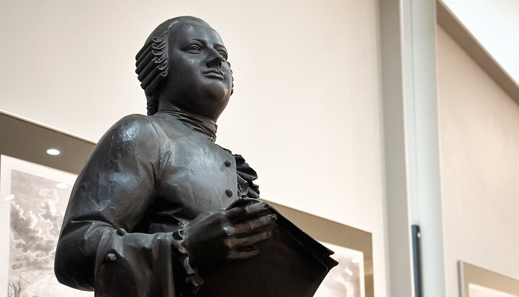 Во втором зале представлена скульптура, поступившая в фонды музея в конце 2025 года: работы Н. Ротанова, П. Игнатьева, А. Кита, А. Фатхуллиной – наших зрелых и молодых современников, активно работающих в области монументальной пластики и «городской скульптуры». Четыре работы известного мастера Евгения Ротанова выполнены в разных жанрах, стилистике, материале. Из них фигура А. Блока – один из многих вариантов памятника, установленного в 2023 году на улице Декабристов, – производит неизгладимое впечатление динамикой «кубистических» форм и красотой полированного гранита. Михаил Ершов на протяжении почти всего творческого пути был погружен в архаику. Такова «Ана» – олицетворение плодотворящей земли, существо таинственное, концентрирующее в себе энергию. Композиция «Скульптор и его скульптура», изваянная Мариной Спивак в мраморе, – художественное лирическое размышление автора о своем творчестве и призвании. Работа выглядит цельной и завершенной, оставляя при этом свободу трактовки её образного содержания. Никита Ротанов – автор интересной по замыслу и лаконичному решению композиции «Бессмертный полк», в которой получила новое прочтение идея сплоченности народа в прошлом и настоящем. «Ксения Петербургская» – эскизный проект памятника, представленный на конкурс в 2015 году. В своей работе скульптор органично сочетает современные пластические подходы с православным иконописным каноном.