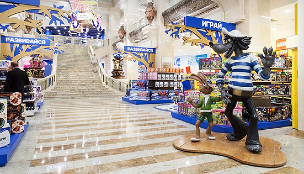 Флагманский «Детский магазин» на Воздвиженке напоминает тот самый универмаг на Лубянке незадолго до закрытия на реконструкцию. Внутри складывается ощущение, что владельцы сети детских магазинов решили сделать вид, будто ничего не произошло. Правда, вместо роскошного памятника советской эпохи магазин теперь находится в особняке лужковских времен. Переделанный «Военторг» с мраморными полами и бронзовыми купидонами на лестнице меньше всего ассоциируется с детством. Наиболее очевидным оммажем в сторону лубянского «Детского магазина» можно считать бутафорскую карусель у эскалаторов. Лошадки на палках есть, но на них никуда не уедешь. Есть и молочные коктейли, как в старом универмаге, только они такие приторно сладкие, что их хочется запить водой. Детей сюда завлекают огромными машинами, голубым вертолетом с крокодилом Геной и Чебурашкой, а также повсюду раскиданными айпэдами. Юные покупатели могут изучить с помощью них, например, ассортимент кукол «Барби». Что касается товаров, то для ребенка действительно можно найти все: от подгузников и колясок до мини-автомобиля и школьной формы. Стены зачем-то украшают надписи «Мам, купи».