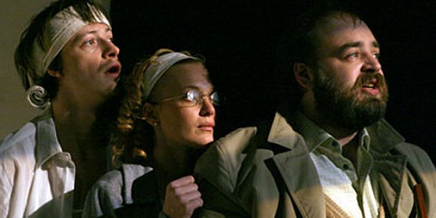 «Носорог» - постановка не самого Фоменко, а Поповски, но мне было интересно сравнить его с «Носорогами» Розовского. Незамедлительно обнаружились главные сходства: иллюстративность обстановки и попытка «озвучить» носорогов душераздирающим рёвом. Впрочем, впадать в истерику в театре Фоменко всё-таки сочли не комильфо – никто не кричит, ничего не рушится, вместо оглушительной «музыкальной темы НЛО» звучит менее выматывающий нервы ритм из малеровской симфонии, имитирующий носорожий топот. Да и просторная сцена, технически лучше оснащённая, позволила сделать декорации мобильными, легко меняющими дворик с кафе на офис, офис на квартиру. Куда как изобретательней решены и сами сцены превращения людей в носорогов: вместо того, чтобы корчиться в конвульсиях и ползать на четвереньках, Жан сначала облачается в тёмно-зелёный костюм, а затем из земли из горшков с растениями и воды из аквариума устраивает болото и вываливается в грязи. Но самым приятным отличием стало то, что упора на комизм, совершенно избыточный и бессмысленный в данной пьесе, у Фоменко, в отличие от театра у Никитских ворот, делать не стали, чередуя забавные моменты с напряжёнными. Беранже из «Носорога», простой, обаятельный человек, способный на адекватные проявления дружбы и любви, выгодно отличается от Беранже из «Носорогов» - карикатурного непросыхающего пьяницы, тупого, грубого и вульгарного. Остальные персонажи в исполнении труппы Фоменко также практически не допускают шаблонности, плоскостности шаржа и наигрыша, хотя назвать их интересными и запоминающимися тоже не поворачивается язык. Метафорические находки Поповски лишь немногим изящнее лобовой прямолинейности милитаристского маскарада Розовского: «первых носорогов» он выводит в первом действии рычащими в микрофоны слугами просцениума в чёрном, с белыми бинтами на лицах, как пародии на героев знаменитой картины «Поцелуй» Магритта, вынесенной на обложку программки. И там, и здесь атмосферу безуспешно нагнетают резкими контрастами освещения, и носорожьи рога в обоих постановках лезут в дыры – хотя если Розовский рогами ограничился, то Поповски не пожалел средств на костюм антропоморфного носорога и движущуюся репродукцию также небезызвестной гравюры Дюрера с носорогом. Однако главный недостаток интерпретации театра Фоменко – не сценография, а затянутость, эмоциональная пересушенность долгих статичных мизансцен, без сокращений пересказывающих авторский текст, от которых за три с половиной часа продолжительности спектакля постепенно становится скучно. Нетрудно теми или иными выразительными средствами передать угрозу «оносороживания», происходящую от пустопорожней демагогии и распространяющуюся по множеству причин, трудно заставить зрителя сочувствовать Беранже – последнему человеку среди бездумной агрессивной скотины. А этого не удалось ни той, ни другой постановке: не видно в Беранже той силы воли, независимости и решимости, которые требуются героям любого психологического склада, выбирающим в одиночестве противостоять всему миру. Создаётся впечатление, словно Беранже-Голубцов спасается от эпидемии алкоголем, а Беранже-Пирогов… джазом. По крайней мере, он очень оптимистично его напевает и пританцовывает в самые критические моменты.