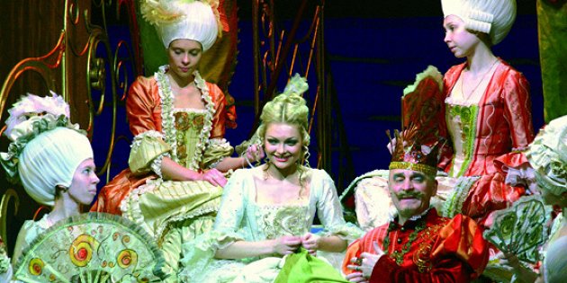 Текст инсценировки Жанны Жердер (она же и ставила спектакль) на девяносто процентов воспроизводит тот сценарий. Девочка в пажеском берете все так же признается, что она еще не волшебник, Золушка учит песенке про жука чудаковатого короля, а тот влюблен в нее не меньше собственного сына. Только Золушка помолодела, хотя и потеряла при этом в непосредственности, и больше не машет указательным пальчиком, выпевая: «Встаньте, дети, встаньте в круг» — этот гимн всех детсадовских утренников.