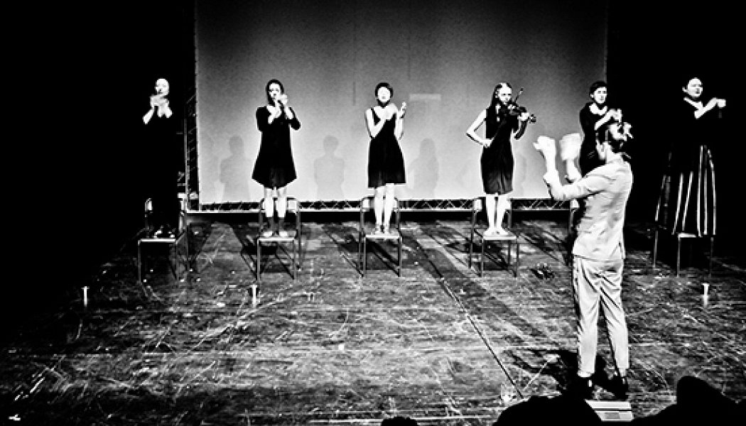 На сцене установлена еще одна сцена. Расставлены черные табуретки, на них — женщины самых разных фактур, все в парадном. Спиной к зрителям у рояля стоит женщина в черном — это дирижер и аккомпаниатор. Весь спектакль актрисы по-всякому перемещаются, играют на музыкальных инструментах, исполняют хоровые опусы в духе Мередит Монк, в текст Введенского вводятся реплики из Чехова, Тургенева и Шекспира. Все это происходит между основными событиями пьесы: убийством девочки Сони в начале, судом над няней-убийцей в середине и всеобщим медленным умиранием в финале. Трюк Барейкиса в том, что он сводит вместе сюжет собственно пьесы и метасюжет об актрисах, отдающихся сцене, и пересекаются они в ключевой для Введенского теме смерти. Когда одна из героинь начинает неистово бить поклоны под овации остальных, ей на шею надевают большой белый квадрат — отделяют голову от тела. Умирает персонаж, но вместе с поклонами и криками «Браво!» заканчивается и жизнь актрисы.