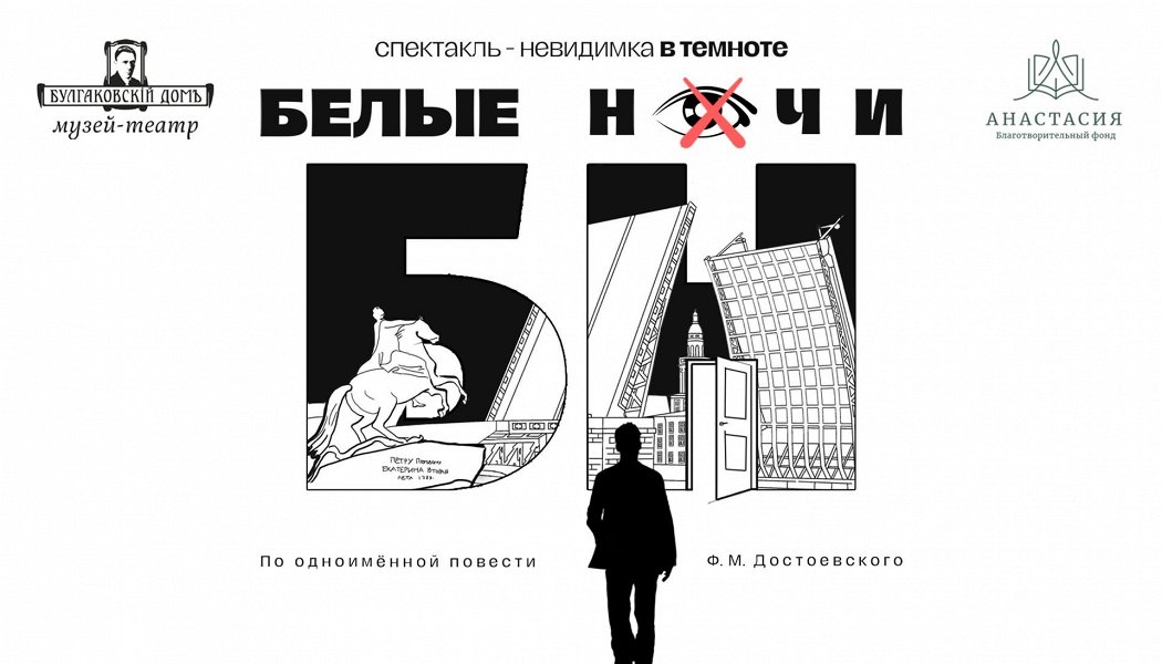 Эта постановка погружает зрителей и актёров в полную темноту и вот тут то и начинается самое интересное: темнота невидимого спектакля бережно обволакивает, становясь верным проводником, в ней оживают хрупкие образы очертаний Петербурга, образы грёз, скрытые от дневного света… Стоит прислушаться к ощущениям и вы поймёте: вот, за вашей спиной Екатерининский канал, а справа — церковь, а вот уже скрипят цепи мостов, встречая весну — время любви и мечтаний.
