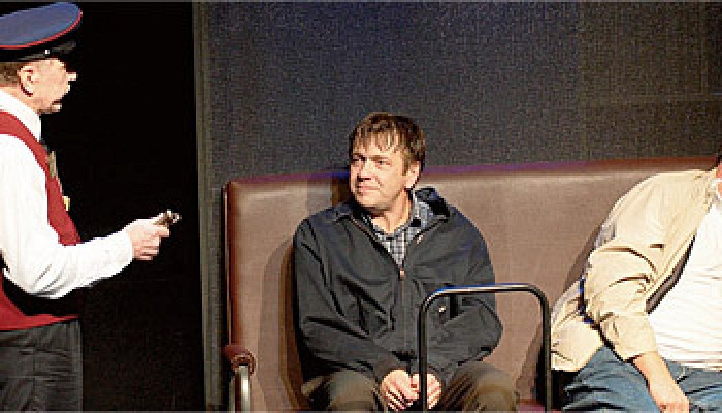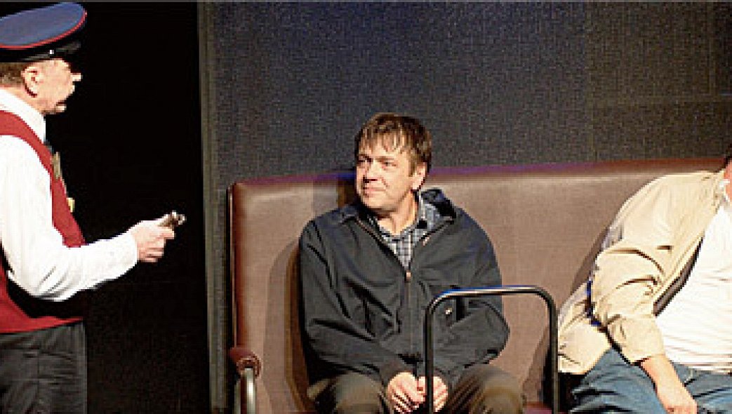 Максимов снимает сразу все метафизические ответы, у него с первой секунды понятно: к другу Рюрику (Геннадий Богачев), русскому эмигранту в Европе, прибыл Володя (Валерий Дегтярь) с родины. Два товарища с тяжелыми клетчатыми сумками челночников, взмокшие, вываливаются на сцену и усаживаются на кожаный диванчик (так в спектакле выглядит вагон). «Пустой?» — ахает «совок» Володя. «А тут в поездах никто не ездит. Тут у всех личный транспорт. Садись», — по-хозяйски повелевает Рюрик. В трех сумках Володя привез Рюрику контрабанду — «кухонные ножи для декоративного украшения стола», чтобы друг их загнал и купил дачу в Испании. Но пока они не могут доехать даже до казенного рюриковского жилья: «европеец» пожалел денег на билет — и приятелей высаживают на каждой станции. Носов очевидно цитирует самую знаменитую из абсурдистских пьес — «В ожидании Годо» Беккета. Там героев зовут Владимир и Эстрагон, и ждут они, что понятно по названию, Бога, который нужен им для смысла жизни, — единственного, чего им не хватает. Русским героям Носова не хватает обычного человеческого комфорта — жизни без грязи и нищеты. Но они всюду тащат за собой свои пороки, и поэтому счастья им не видать. Берендей, как называет себя Рюрик, ассоциируется не только со сказкой «Снегурочка», но со словом «прохиндей», которое в свою очередь отсылает к Булгакову и Гоголю. Геннадий Богачев играет Рюрика простым узнаваемым русским хамом за границей — халявщиком, жмотом, хапугой, который даже язык не учит, потому что ему лень вставать в десять утра на бесплатные курсы. Володя в исполнении Валерия Дегтяря гораздо ближе носовской трактовке: это замученный жизнью интеллигент, сотрудник издательства, который надеется напечатать собственный роман «Помутнение роговицы» и, воруя, не утратил еще способности испытывать чувство стыда (точно как герой Ильфа и Петрова).