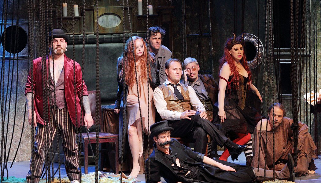 Все действие спектакля проходит в "нехорошей квартире" Булгакова, где в самом начале появляется он сам. На протяжении всего спектакля она удивительным образом вдруг превращалась то в Патриаршие пруды, то в сумасшедший дом, то в древний Ершалаим, то вообще в преисподнюю. Здесь вино, письма и рукописи появляются из стены, медсестры словно перенеслись из кинофильма "Звонок", нечисть спускается с потолка, со сцены разбрасывают купюры, а зрители становятся участниками сеанса черной магии в Варьете. Столь же удивительно как пространство, перевоплощались и актеры, ведь каждому из них выпало играть в этом спектакле нескольких персонажей. А еще они были в роли кукольников, в чьих руках оживали их молчаливые коллеги - детища Бориса Чернышева. Удивительная коллаборация актеров и кукол добавляла спектаклю мистики и объема. Как только появлялись куклы, у зрителей включалось воображение, а актеры замирали, оставаясь незаметными позади оживших фигур.