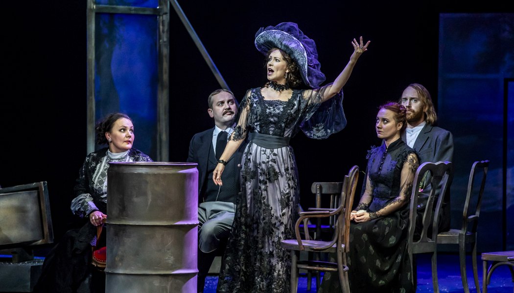 Интересные декорации в виде многослойной рамы, части которой разъезжаются и преобразуются в комнату усадьбы, в поляну у озера, в ряды зрителей перед сценой.