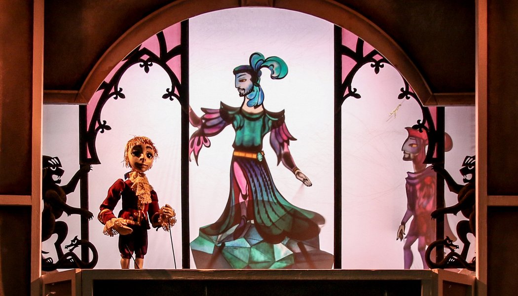 Помимо собственно теневых кукол и эффектов задействованы марионетки и даже есть человек-актер в старинном костюмом и маской на лице.