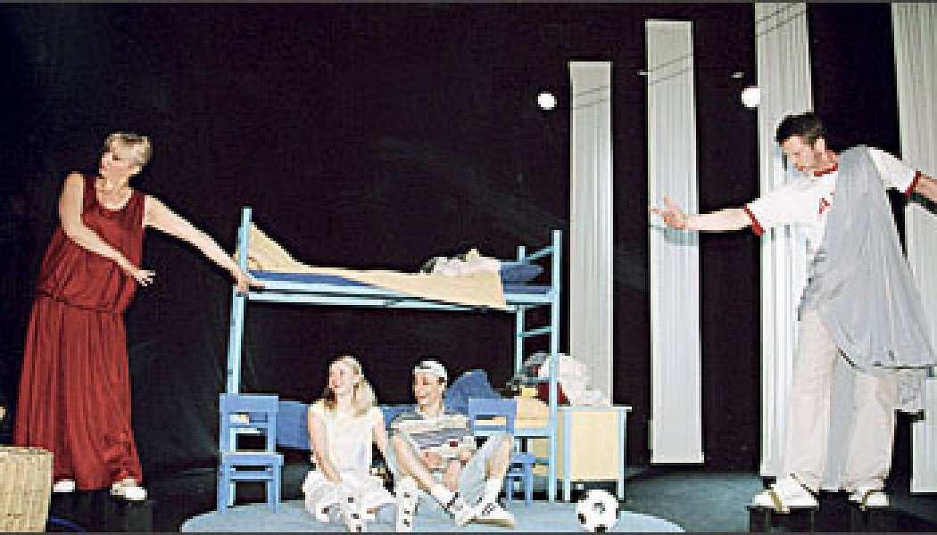 На сцене: двухъярусная кровать, стульчики-малютки и прочие желто-синие атрибуты детской комнаты в стиле «Икеи». По диагонали вглубь уходят пять белоснежных колонн из плиссированной ткани: все ж таки Греция. Героиня Виктории Виноградовой Медея — единственная, кто на протяжении всего спектакля существует в трагическом жанре: говорит еврипидовским слогом и, заламывая руки, взывает к мести богов. Она одна одета по-гречески — в пурпурный хитон, остальные персонажи тотально осовременены: у Ясона футболка с лого «Арго» — его футбольной команды, у детей — джинсовые куртки и кепи. Ясончик и Медейка (убедительный дуэт Игоря Мосюка и Натальи Виноградовой) бесконечно обезьянничают, болтают по-английски («Хэллоу, фазэ!»), с помощью пальцев и плевков объясняют друг другу, что такое «разойтись-разъехаться» и что скрывается за загадочным для ребенка словом «депрессия». Вся «мокрушная» часть мифа, где мать из мести убивает своих детей, остается в страшном сне Медейки — та пересказывает сон в славном стиле страшилок Григория Остера (стиль срабатывает как терапия). «В том сне, где нас зарубили топором, — рассказывает она брату, — твоя голова покатилась, ее подобрал папа. Он собирался поиграть ею в футбол, но сказал: «Опять ты не почистил зубы!»