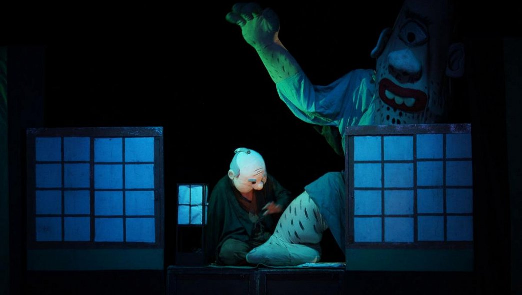 Эта история произошла в эпоху Эдо (где-то в XVII или XVIII в.). В то время летом любили слушать истории о встречах с оборотнями, демонами и привидениями. Их придумывали рассказчики, которые сами их и представляли. Это и было ракуго. А этот спектакль с его премьеры в 1990 г. с удовольствием смотрят по всей Японии и дети, и взрослые. Ведь в нем не только рассказчик, но и куклы в ролях оборотней. Богатый и скупой старик Хэйзаэмон (актер в маске) известен всем грубым обращением со слугами. И Гонсукэ только и мечтает покинуть хозяина, но ему надо найти себе замену. Да кто согласится? В городе сдается дом с оборотнями, первый год в нем можно жить бесплатно. Гонсукэ понимает, что такое жилье заинтересует хозяина. Вот он и говорит, что оборотни готовы прислуживать Старику. Старик переезжает. Всю ночь появляются оборотни, пытающиеся его напугать. Свет солнца прогоняет самого большого из них. Открывается дверь, входит уставший тануки (енотовидная собака-оборотень) и признается, что это он был всеми необычными существами этой ночью. Старик восторгается таким мастерством, ведь оно дало ему множество слуг. Но тануки признает превосходство человека. На прощание он весело танцует со Стариком. Перед спектаклем для создания на сцене атмосферы эпохи Эдо состоится традиционная уличная демонстрация с длинными бамбуковыми шнурами. Спектакль идет на японском языке с синхронным переводом на русский язык.