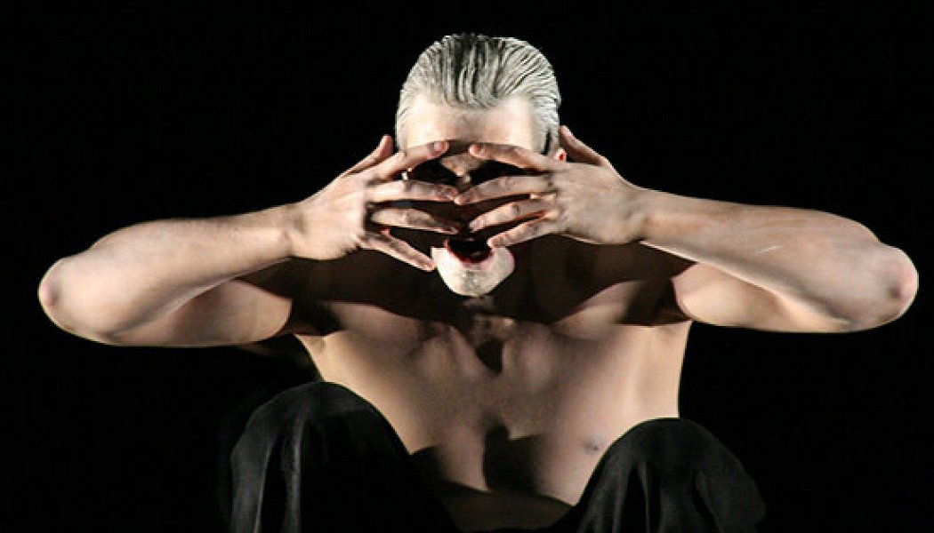Станиславский, как известно, считал: хорош тот спектакль, который можно смотреть без звука, притом понимать его до нюансов. С выключенным звуком «Эдип», которым открылся после реставрации Александринский театр, выглядел бы так. Черный задник, черный круглый помост на черной сцене, на помосте человек в черном бархатном халате и черных штанах — человек подался вперед, что-то горячо говорит, то есть открывает рот; десять минут открывает рот, двадцать минут, тридцать… Единственно, внимание время от времени отвлекают десять обнаженных по пояс молодцов, в правой и левой кулисах по пять, откуда они выдвигаются словно какие-то механизмы, четкие, ритмичные, синхронные, в затылок друг другу; лица и волосы у них набелены, мускулы у них как у богов, гримаса как маска — и тоже вдруг раскрываются одновременно их обеззвученные рты.