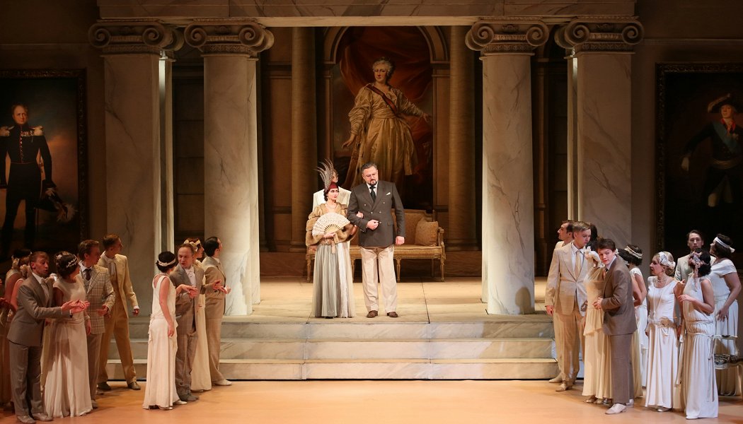 Дом с колоннами присутствует. Три акта тоже. Снежок в сцене дуэли увы не идет. Высшее общество одето в пиджаки и галстуки, хорошо хоть дамы не в брюках, одежда на персонажах усадьбы Лариных ближе к тому времени, но не без выдумки. Свет поставлен плохо. В новом зале Стравинский с окнами в стенах и глубокой яме в земле, создается ощущение , что находишься на улице. Оформление вновь возведенной части театра китч 90, классический новиопский стиль и реконструкция постановки Станиславского неплохо в него вписалась.Похоже, что Бертман все это делал искренне, по сей причине будет к нему снисходительны, тем более мне достался молодой состав исполнителей пели они неплохо и явно старались, ну и опять же какая никакая актерская игра присутствовала.