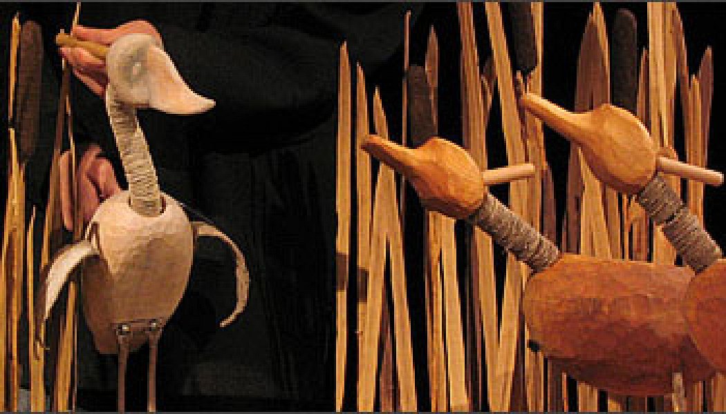 Невеселая, далеко не приключенческая — заунывная, прямо скажем, — сказка в должной пропорции сдобрена комическими моментами (чего стоит одно иерархическое построение птиц у кормушки). Сценография минималистична: три деревца, две кочки тростника, тазик с водой в роли пруда — вот и все, практически, декорации. Куклы несколько грузны и неповоротливы, но это с лихвой компенсируется звукоподражательской сноровкой артистов. Лишь под конец спектакля, когда со сцены уже крякнуто и скудахтано на все возможные лады, у кукловодов во рту появляются приспособления типа свистулек, позволяющие еще больше разнообразить звукоряд. Но они — от лукавого. Чистая ловкость губ: на ней постановка и держится.