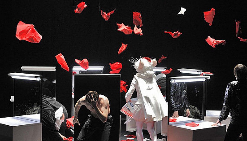 Как, впрочем, нет случайности и в его спектакле: он умно придуман и так плотно и жестко застроен, что мыши не проскользнуть. Впрочем, Коршуновас предусмотрел этот упрек и завел в своем Эльсиноре мышь — ростовую куклу, которая мерещится Гамлету то тут, то там и розовым цветом своих ушей разбавляет черно-белую картинку спектакля.
