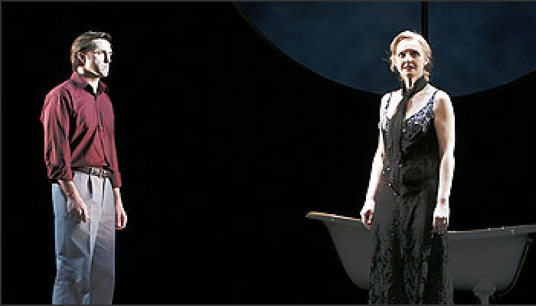 Сразу же вслед за премьерой в театре вещь была экранизирована с Вивьен Ли; и ей, и игравшему Пейджа Кеннету Мору было тогда чуть за сорок. Теперь «Глубокое синее море» вышло в Вахтанговском театре. И все тут можно понять: почему так однообразны мизансцены Павла Сафонова (он никогда еще не работал на такой большой сцене); почему основной визуальный образ спектакля — ванна на фоне иллюминатора с морскими гадами (в самом обыденном таятся глубины драматизма, сигналит нам сценограф Максим Обрезков). Понятно, почему так часто взвизгивает Евгений Князев в роли рогатого мужа (ректор Щукинского училища демонстрирует студентам, как играть неприятных людей). И то, почему на спектакль будет ломиться народ, тоже понятно: как же, как же, рокового летчика играет Владимир Вдовиченков. Одного не могу понять: зачем Хестер и Пейджу придумали такую адскую разницу в возрасте. Нет, актриса Елена Сотникова действительно роскошная женщина, брючные костюмы и вечернее платье, пошитые Евгенией Панфиловой, ей очень к лицу. Но ее влюбленная Хестер старше Пейджа лет на десять, и будь Владимир Вдовиченков чуть менее брутальным, он выглядел бы рядом с Хестер ушлым жиголо. Но для возраста его возлюбленной тоже, видимо, есть объяснение. И очень простое: раз согласился молодой режиссер ставить кассовую мелодраму, что не вполне комильфо по понятиям молодых режиссеров, то надо ему было эту вещь испортить (простите — углубить). Сексуальные перверсии для такого случая — самое оно.