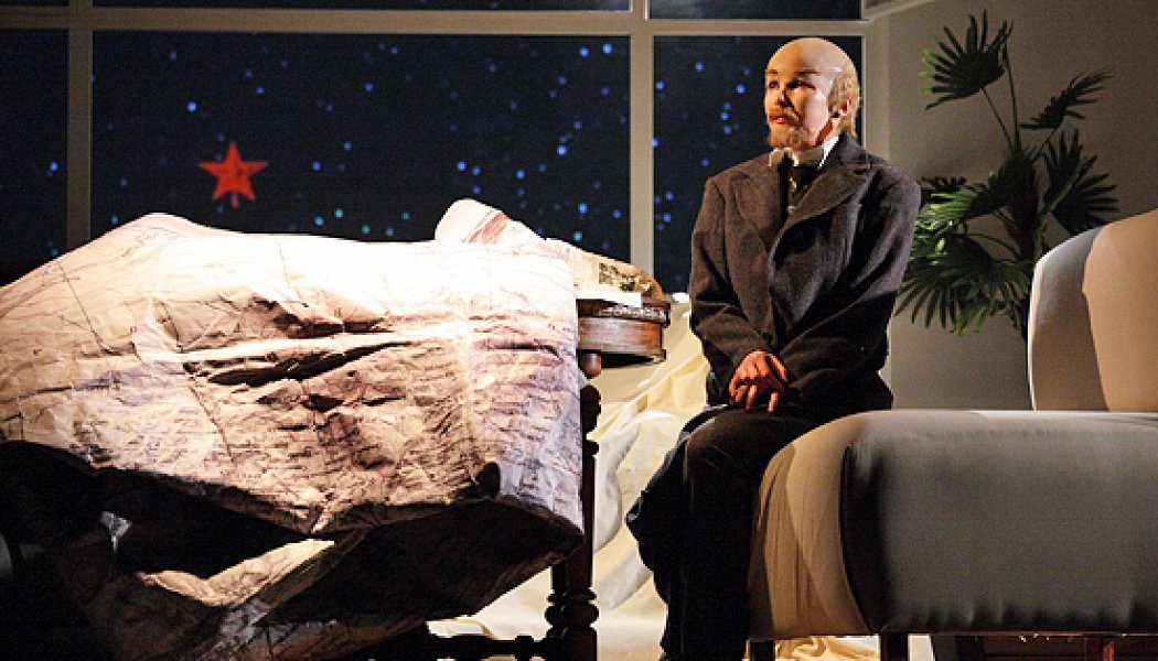 Дмитрий Крымов весело разбирается с прошлым. Поскольку сам он — художник, педагог и режиссер — плоть от плоти советского театра (сын выдающегося критика Натальи Крымовой и великого режиссера Анатолия Эфроса, рядом с которым сын дебютировал как сценограф), то и счеты к прошлому у него театральные. В первой части спектакля он демонстрирует захватывающий трюк: на наших глазах сперва оживает картина Бродского «В.И.Ленин в Смольном», в нее инсталлируется сюжет пьесы Погодина «Кремлевские куранты», затем они вместе — сюжет, картина и герои — трижды претерпевают метаморфозы. Ленин из канонического картавого в кепке превращается в забитое дитя, Дзержинский — в кентавра, Крупская — в домомучительницу, инженер, отказавшийся участвовать в ГОЭЛРО, недосчитается зубов, а другой со страху готов строить электростанции где угодно, хоть бы и на Волге. Дальше разворачивается потешный и бесцеремонный соц-артовский комикс по мотивам главных пьес советского театра. В одной из них, «Оптимистической трагедии» Вишневского, есть эпизод: старушка, у которой украли кошелек, указывает на одного из матросов — и его кидают за борт. Потом старушка находит у себя кошелек, и ее тоже бросают за борт. Вот и Крымов весело топит и идеологически выдержанную «Оптимистическую трагедию», и пронзительные «А зори здесь тихие», и оттепельную розовскую пьесу «В поисках радости», которую, на минуточку, ставил сам Эфрос. В финале на сцену выбегает, смешавшись с героями Розова, толпа разных Симпсонов и Чебурашек. И взбесившийся «розовский мальчик», который в пьесе рубил мещанскую мебель, расстреливает их всех на радость тетке, выскочившей, образно говоря, из «Оптимистической трагедии», а буквально — из зрительного зала, с воплем, что у нее украли кошелек. «Жизнь невозможно повернуть назад», — поет подвыпившая тетка, пробираясь к выходу через трупы.
