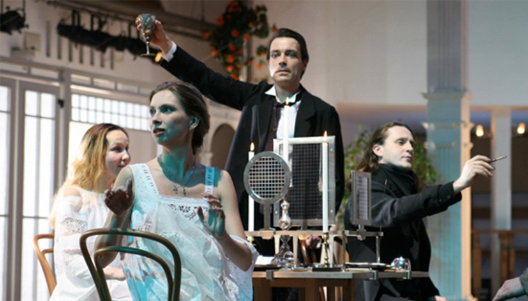 «Школа драматического искусства» Анатолия Васил ьева вновь играет спектакль «Из путешествия Онегина» — вольную композицию, сочинявшуюся актерами и режиссером сообща и почти столько же, сколько и сам пушкинский роман в стихах. «Атакующее слово» — привычная васильевским актерам и дикая на иной взгляд чтецкая манера — дробит, сокрушает пушкинскую строку до первоэлементов. Из них театр химичит новые, горькие и едкие, соединения.