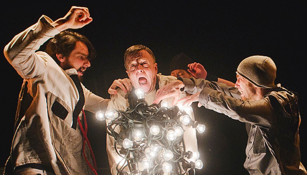 Cпектакль длится рекордно короткие для Meno Fortas два часа, но монотонный ритм дает ощущение резиновой нескончаемости. Героическая синтезаторная музыка Леона Сомова вместо необходимого актерам подъема передает неожиданный привет из телевидения 80-х, вступая в диссонанс c библейскими строками вроде этих: «Кости мои прилипли к коже и плоти моей, и я остался только с кожею около зубов моих» (Някрошюса иногда хочется сравнить с Леонидом Федоровым, и этот момент — нежданная рифма с федоровским «Губы одна к другой прилипли, чтобы зубы изо рта не выпали»). Не менее неожиданными кажутся и горящие лампочки, стоглавой гроздью свисающие с шеи Иова, — внезапный спецэффект посреди более чем лаконичной сценографии.