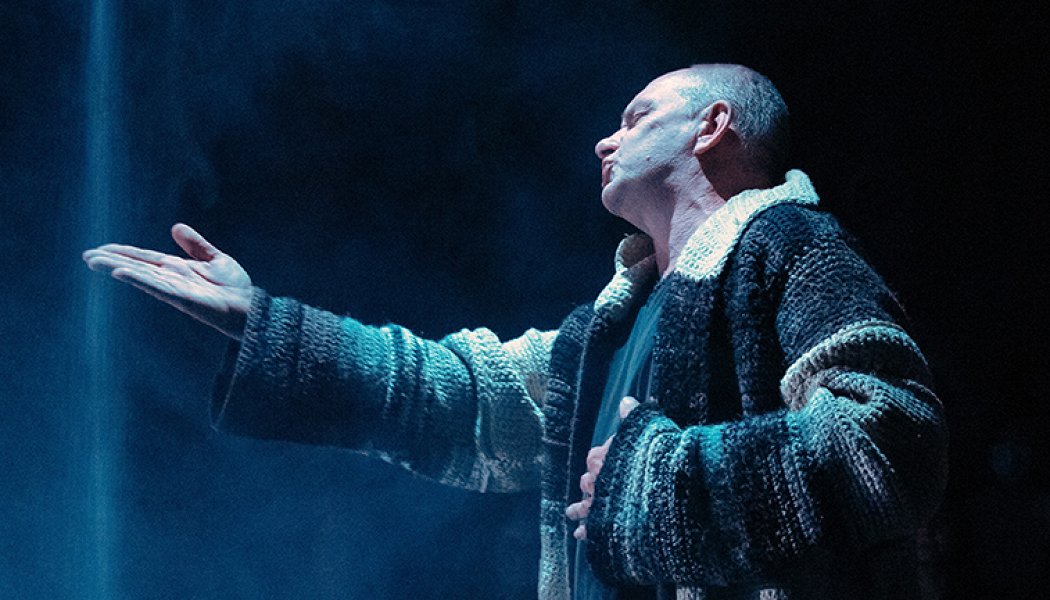 Нарушает строгий ритуал, конечно, сам смертник. Между циничными репликами королевы злой и сочувственными взглядами королевы доброй он мечется в меланжевой мантии-халате и домашних шерстяных носках в полнейшей истерике. В то время как режиссер и драматург настроены как раз помочь королю спокойно и с достоинством встретить свою смерть. Пути к одной цели им видятся разные, и примирить их в одном спектакле мог только замечательный Поднозов. В пьесе Ионеско нет места тибетской Книге мертвых с обширным предисловием Юнга, но она чрезвычайно мила сердцу режиссера, поэтому Слюсарчук и Поднозов затевают игровой антракт — маленький моноспектакль, где актер на пальцах, в манере Гришковца, доказывает, что душа бессмертна.