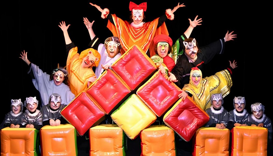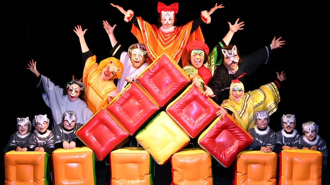 В спектакле много актеров на сцене, при этом там не так много героев, это вроде «рассказчики». Вместе с большими надувными кубиками они выходили между сценами и комментировали происходящее. Это придавало динамичности. Актеры все молодые, яркие. Премилые девчонки, играющие котят, так старательно пели!