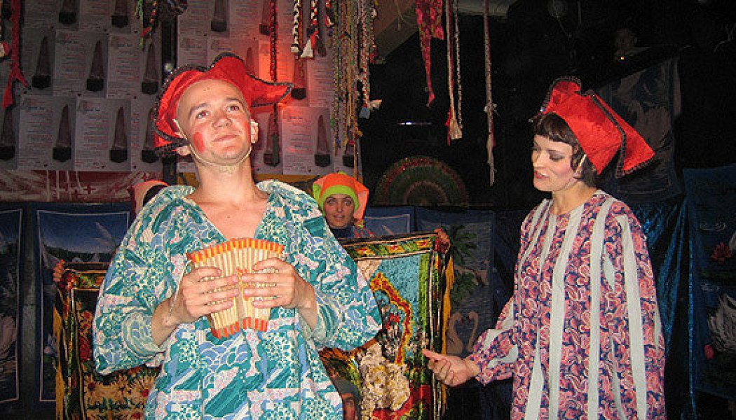Интерактивный спектакль-игра для самых маленьких. Веселые скоморохи шутками да прибаутками развлекают дорогих гостей, рассказывают да показывают сказки кто лучше и кто интереснее, да и все вместе. Минимум декораций, простые скоморошьи наряды, русская народная музыка. Дети участвуют в сказке вместе с актерами: помогают прогнать хитрую лису, обучают маленького котенка, поют вместе с мышкой, ходят с журавлем жениться. Играется спектакль в балаганной ярмарочной манере с открытой подачей к зрителю, актеры общаются непосредственно с детьми и взрослыми.