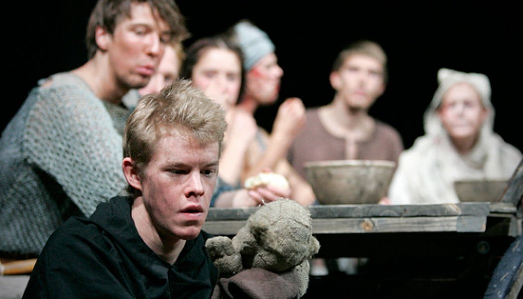 В прошлом году руководитель таллиннского «Линнатеатра» Эльмо Нюганен привозил на «Радугу» спектакль по пьесе Жан-Люка Лагарса «Мы, герои» про еврейский бродячий театр в Европе накануне коричневой чумы. Герои «Красных носов» бродят по средневековой Европе, пораженной самой настоящей чумой. На сцене сено и старая крытая телега. В труппе слепые актеры, одноногие танцоры и другие уродцы, словно нарисованные Питером Брейгелем-старшим. Ими всеми предводительствует романтический герой, монах-францисканец. Молодые актеры, недавние выпускники класса Нюганена в Школе театрального искусства при Музыкальной академии Эстонии не боятся быть отчаянно смешными, разыгрывая лихой фарс, но и страстные, трагические монологи и эффектная смерть за прекрасную идею им удаются ничуть ну хуже.