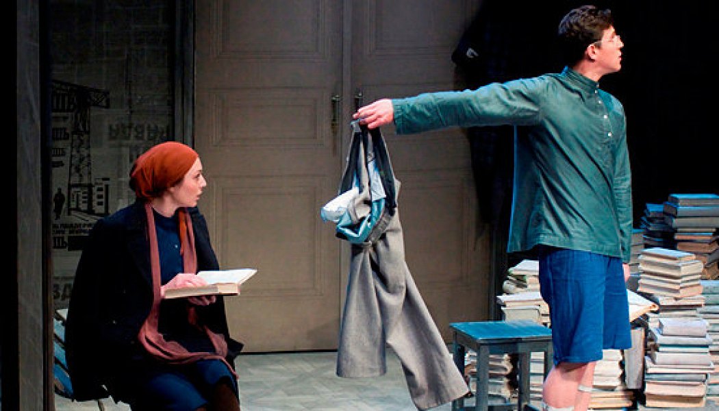 В полной темноте — шум и испуганный женский вскрик: «Ай, я обо что-то зацепилась юбкой!» И тут же одинокая лампочка, стыдливо, как кажется, мерцая, освещает невозможную нищету: стены, оклеенные газетами, единственная кровать в одном углу, пыльные связки книг — в другом, в центре — скамейка, причем уличная. На стене слева — радиорупор, который на протяжении спектакля будет вмешиваться в частную жизнь с государственными установками. Лампочка при этих звуках станет совсем уж панически мигать, словно посылая в космическое пространство сигнал SOS. А две пары молодоженов тем временем будут пытаться выстроить семейное счастье. И велосипед в темном коммунальном коридоре, о который невозможно не споткнуться, вовсе не единственная преграда на их пути. Главное, что идеологические установки в разделе семьи и брака, такие прекрасные в теории, на деле дают очевидный сбой. Сходство характеров, рабочий контакт и общие политические взгляды налицо, а жизнь не складывается: нежного, уютного Абрамчика (Иван Федорук), знающего толк в электромагнитной теории света, все время тянет на половину друга Василия — вроде бы к котлетам и яичнице, а на самом деле к беспартийной хозяйке Людмилочке (Нина Петровская). А статный Василий, потенциальный герой комтруда, бросает такие взгляды на железную комсомолку Кузнецову (Мария Сандлер), которым место только в феодальном прошлом.