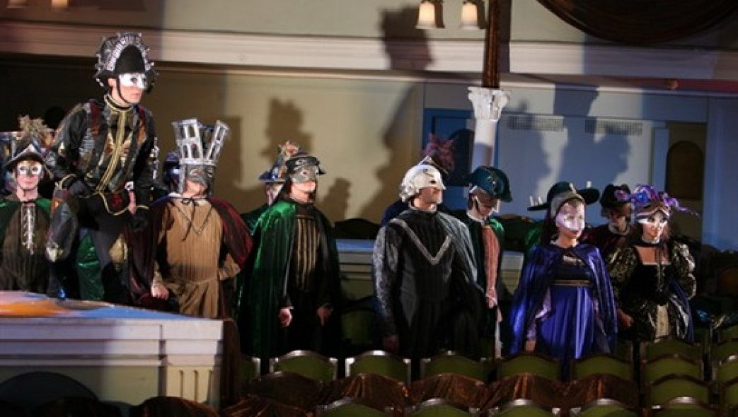 Первое, что надо отметить – оригинальную постановку, позволяющую осуществить исконную мечту любого зрителя - оказаться во время спектакля на сцене. Актёры играют в обычном зрительном зале РАМТа, преображая пространства балконов, амфитеатра и бельэтажей во флорентийские домики и романтические балкончики. Сцена органично изобилует классическими итальянскими ариями и масками, однако «академичность» умело, по-рамтовски, сочетается с лихой «молодёжностью» - в какой-то момент из уст герцога Медичи звучит даже рэп!