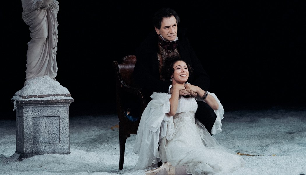 За что я сразу же, не отходя далеко от кассы, похвалю Римаса Туминаса – так это за то, что он постарался поставить неоднократно ставленный до него «Маскарад» по-своему, оригинально, и это у него получилось. Обидно то, что сосредоточился маэстро на чисто визуальных находках, с удовольствием неоднократно их повторяя, упустив из вида психологическую и эмоциональную глубину лермонтовского произведения. Действие происходит на зимнем кладбище, из которого постепенно растаскивают памятники, чтобы потом Нина превратилась на нём в памятник себе самой. На сцене много, очень много бутафорского снега, созданного – я нарочно подошла потрогать в антракте – из мелко накрошенной белой бумаги, так что когда дважды объявляется: «Сейчас Арбенина споёт нам что-нибудь», так и кажется, что она исполнит: «Белым, белым кроет снегом…» своей однофамилицы, Дианы Сергеевны. А когда этот снег обильным потоком сыпется сверху, происходящее приобретает кинематографически-завораживающую, головокружительную красоту, создаётся эффект движения находящихся на сцене людей куда-то вверх и вдаль – так же, стоя на берегу и глядя на встречный бег волн, чувствуешь, словно сам несёшься вперёд. Всякий раз публика встречала снегопад аплодисментами, как выход какого-нибудь прославленного актёра. Всеобщий слуга, по совместительству – городской юродивый, он же, по программке, – «человек зимы», - аки Слава Полунин, скатывает снежный ком, постепенно увеличивающийся в размерах и в финале накатывающий на Арбенина огромным шаром, что как бы символизирует. Труп с зажатой в руке картой раз за разом всплывает, сколько бы его ни топили в проруби, что как бы символизирует тоже. Но если с оформлением вся концептуальность ясна как на ладони, то размазанный на три часа сюжет явно хромает: в первом действии, открывшемся мучительно затянутой пантомимой с шаманством слуги зимы, он и вовсе рассыпается на отдельные эпизоды, тонет в гротескной и удачной, но чрезмерной массовочной клоунаде. Внимание к массовке, вообще, тут мизантропично «по Гинкасу» - толпа веселится, сплетничает, казнит, но всегда передвигается, сбившись «свиньёй» в лучших традициях героя по имени «стадо». Второе действие, также юмористических номеров не лишённое, вышло более цельным и напряжённым, в нём я наконец-то разглядела Лермонтова под толщей снега, наконец-то расслышала его текст и после выразительной, убедительной сцены умирания Нины на руках Евгения наконец-то перестала скучать и начала смотреть со вниманием. К сожалению, больше ничего подобного я не увидела – и не только из-за режиссуры, но и из-за актёрской игры. Самым точным попаданием в образ одиночки-эмансипе показалась мне баронесса Штраль (Вележева), достаточно харизматичен был и Арбенин (Князев) – вот только сквозь холодную насмешливость лермонтовского демонического мстителя и игрока у него прорываются жалкие истерические нотки. Да и развития персонажа в нём не получилось: этот Евгений был не раненым в самое сердце любящим мужем, приносящим чувство в жертву чести, а изначально «злодеем», так и ждущим повода, чтобы с облегчением сорвать осточертевшую маску добропорядочного семьянина и пуститься во все тяжкие. Что до остальных, то преувеличенно смешливая Нина (Волкова) и преувеличенно же суетливый князь Звездич (Бичевин) превратились в карикатурные 