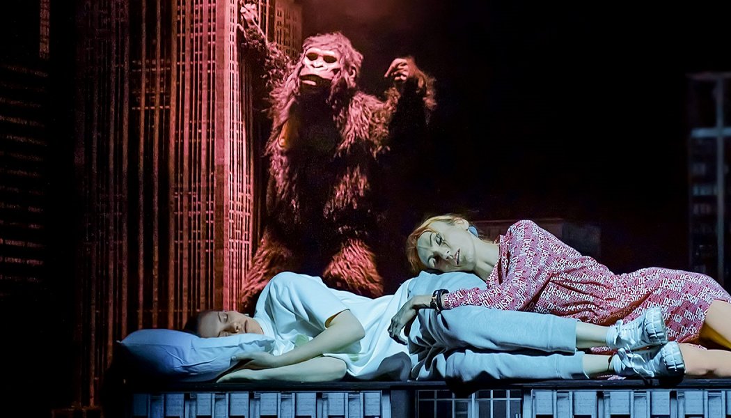 Невозможно не отметить, насколько естественными были все персонажи, совершенно не думалось о том, что это спектакль. Богдан Щукин в роли Лео, Марина Дианова в роли Аси (Ариэль), Валерия Королева в роли Маргариты и Александр Борисов в роли Натана сделали этот спектакль еще более близким для зрителя благодаря невероятно реалистичному воплощению героев. Стиль сценографии у Юрия Грымова мной уже узнаваем – темная сцена, яркие световые пятна с акцентами, качественная музыкальная подборка, как всегда не без классики рока. В качестве декораций спектакля выступает макет городских каменных джунглей, незримые лианы которых давно опутали героев. И все же, как уютно смотрятся огоньки окон в темном пространстве сцены. Мгновение – и небоскребы становятся сказочным пейзажем, виднеющимся из окна Нью-Йоркской квартиры героев. Еще мгновение – и из-за туманных башен появляются люди в масках, динозавр и даже Кинг-Конг, демонстрируя нам фрагменты Машиного сна. Отсылка ли это к американской истории и культуре или олицетворение подсознательных страхов Маши, но выглядит это, как сейчас принято говорить, «крипово».