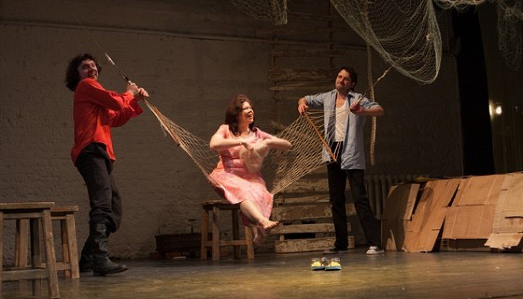 Ощущение, которое горожанин испытывает в деревне, сравнимо с тем смешанным чувством восторга и ужаса, которое приписывают новорожденным. Ксения Драгунская написала пьесу про деревню и назвала ее "ОЩУЩЕНИЕ БОРОДЫ". Ксения Драгунская потомственный горожанин: внучка известного писателя и сама драматург. Кроме того, она еще и умница, поэтому даже не притворяется, что может передать это самое ощущение. У нее в деревне В.Дворики живут персонажи, вынутые из разных книжек, а русский дух, ухающие по ночам чудовища, мертвые князья, русский бунт, жестокий и бессмысленный, и все прочие бородатые атрибуты национального даны не в ощущениях, а в представлениях. Меж тем поставившая пьесу Ольга Субботина по роду деятельности и по склонности переводчик представлений в ощущения. И покуда на сцене поет, хохочет и хохмит молодая и очень приятная компания актеров Субботиной, представления превращаются, растворяются, замещаются не чем иным, как ощущением как хочешь его назови. Хочешь ощущением бороды. Хочешь ощущением того, что мы на земле не первые. И не последние.