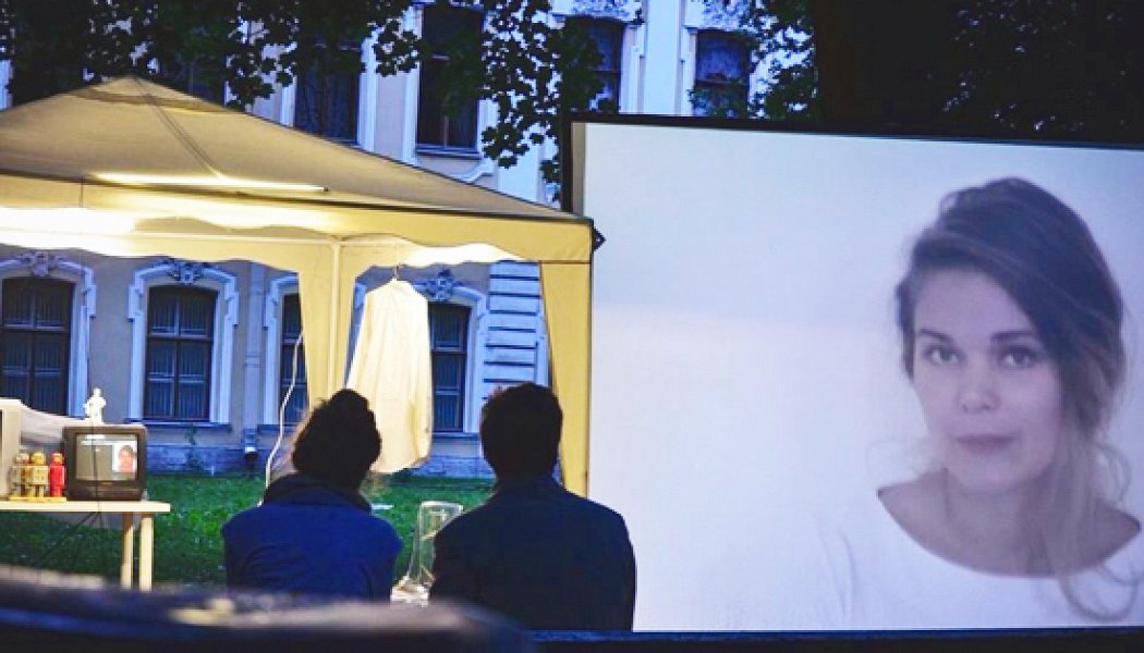 На газоне сквера возле Музея Ахматовой расставлены тенты, прикрывающие от обыденного питерского дождя столики с телевизорами и кучи проводов, — со стороны все это выглядит точь-в-точь как лагерь съемочной группы на выезде. Только вместо режиссерской группы под тентами этими рассаживаются и надевают наушники зрители, чтобы полтора часа вместе с закатом наблюдать за тем, как в прямом эфире на экранах рождается кино про человека, который стал роботом.