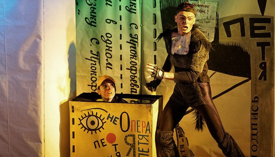 Аркадий Гевондов — аспирант худрука «Зазеркалья» Александра Петрова — разглядел в приключенческой истории про то, как пионер Петя в окружении друзей боролся со страшным волком и в итоге поместил злодея в зоологический сад, цирковое представление. Ребячество прокофьевской музыки, прозрачный лаконизм текста — в самый раз для цирка. В результате на крошечной сцене Белого зала дети встречают птичку-эквилибристку, дедушку-силача, волка-иллюзиониста, охотников-клоунов; круглое пространство создано амфитеатром зрительских рядов и оркестром. Пионер Петя, похожий на мальчика Вольку изфильма про Хоттабыча, цирковыми способностями не отличается, но задуман очень грамотно: он играет, демонстрируя ряд простейших действий, доступных каждому ребенку в условиях дачи. Пустое пространство превращается в цирковое его руками — при помощи десятка колышков и оранжевой веревки. Обруч служит либо окном, либо, что уж совершенно неожиданно, нимбом над съеденной уткой. Каждая картинка-эпизод словно бы сложена из ярких кубиков, персонажи, как герои хороших мультфильмов, запоминаются с ходу. Петя — целеустремленный взгляд и восторженная улыбка, птичка — гордая осанка и ритмично хлопающие ресницы, утка — ласты, клюв и неуклюжая пластика, кошка — манишка, грация и хитрый прищур. Актеры не забывают дать зрителям возможность включиться в действие и вовремя задают актуальные вопросы типа «Где прячется волк?». Дети вряд ли вспомнят, чем отличается гобой от фагота и в чем суть полифонии, тутти и соло, но уж точно не забудут, как помогали Пете найти волка, докричаться до утки, разбудить птичку и отмаршировать финальный парад-алле под очень удобную для всех этих затей музыку большого, очень большого композитора — независимо от того, знает ли кто-нибудь, что это за зверь такой, пионер.