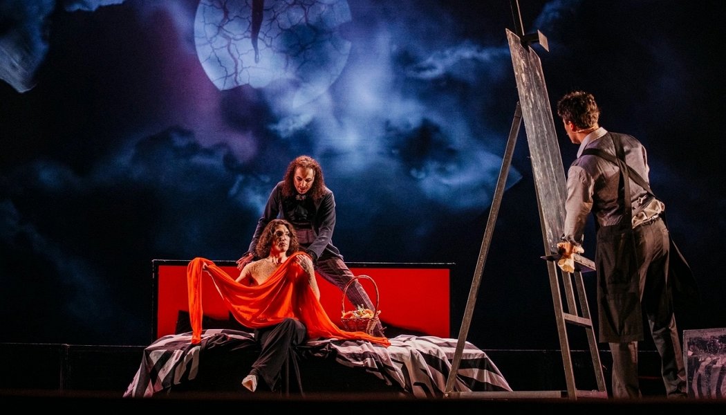 Однако чем дальше, тем лучше становится происходящее на сцене. Во-первых, стоит отметить яркие, запоминающиеся костюмы и работу со сценой. Меня особенно сразил опиумный притон: ориентальные детали, ширмы, золотые драконы (мотив избитый, но обыгранный по-новому на костюмах, изображавших, видимо, собственно опиум). Бордель в первом действии тоже был прекрасен, с девушками в аквариумах и танцовщицами в платьях с золотыми цветами. Хорошо представлены сцены из викторианской жизни: скачки, гольф-клуб. Сцена в порту, где крабы в серебряных трико и с крабьими ножками на спине ловят в сеть падшие души, очень красива и необычна для такой тематики.
