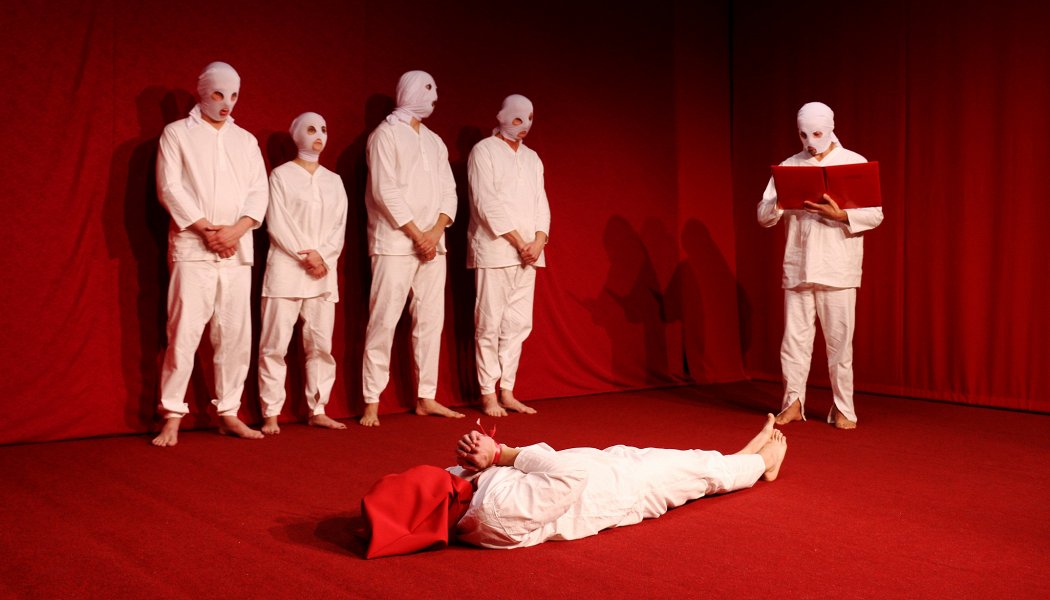 На сцене — репортаж из альтернативной реальности. Точнее, сразу из трех реальностей: где смерть никого не удивляет, где правда и ложь поменялись местами, где религия и закон важнее здравого смысла…