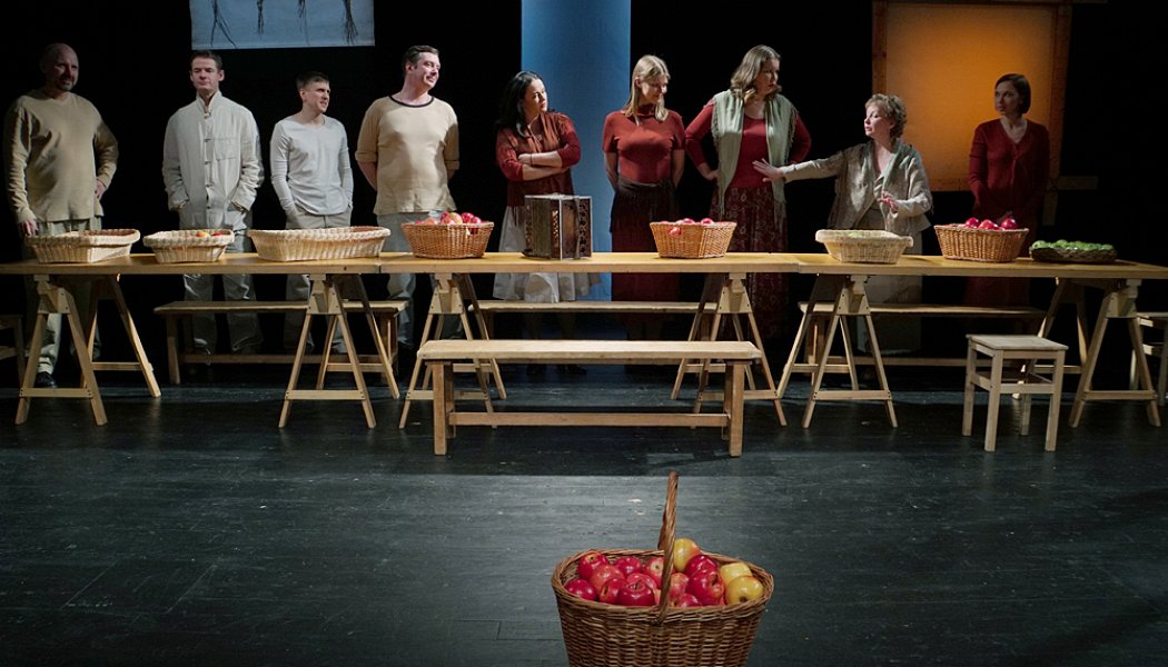 Это не вполне драматический спектакль. Правильнее было бы его назвать музыкально-литературным вечером, с той разницей, что все четырнадцать актеров (по преимуществу молодых) исполняют не каждый свой рассказ или отрывок, а все по очереди, перехватывая друг у друга роли, читают в первом действии рассказ Виктора Астафьева "Пролетный гусь", а во втором - его же "Бабушкин праздник". Не разыгрывают его, превращая описания действий в само действие, как это делают Петр Фоменко или Кама Гинкас, а именно что читают, глядя прямо перед собой в публику, и время от времени хором - в унисон или ладно разложив ее на голоса - затягивают песню: "Ой, цветет калина в поле у-у-ручья-а-а " Малая толика театра в спектакле присутствует: то актеры, тарабаня ладонями по коленям, изобразят стук колес поезда, а из развешенных за их спинами щелястых деревянных щитков, как сквозь стены теплушек, пробивается полосками свет. То две актрисы подыграют Валерию Трошину, и его монолог от лица забредшего на праздник пьяницы заиграет, зазвучит глубже и пронзительней. И вряд ли можно сказать, что режиссер Марина Брусникина спасовала перед прозой: правильнее будет сказать, что она из нее самоустранилась. Отошла в тень, почтительно склонив голову перед сочной, плотной, почти материальной, выворачивающей наизнанку, пробирающей до костей астафьевской прозой. В первом его рассказе речь идет о послевоенном бедствовании хороших и честных людей, помиравших, в то время как жирели жены окопных политруков-мародеров. Во втором - о дне рождения бабушки, куда съезжались сыновья с женами и ребятами. Композиционно это застолье в бабушкину честь становится поминками по тем, кто помер в "Пролетном гусе". Но еще и "по тем, кого мы знали и любили, по нашим родным и близким", как написала в программке Марина Брусникина.