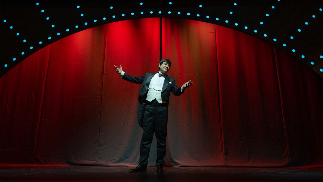 Очень сложное ощущение - с одной стороны, мы зрители и просто смотрим спектакль, с другой - главный герой, кажется, ведет с нами диалог, не то чтобы разрушая четвертую стену, но делая ее проницаемой, как портал между мирами. Как будто дает нам возможность, не выходя из зрительного зала, оказаться там, в 1941, чувствовать в проживать это вместе с артистами эстрады.