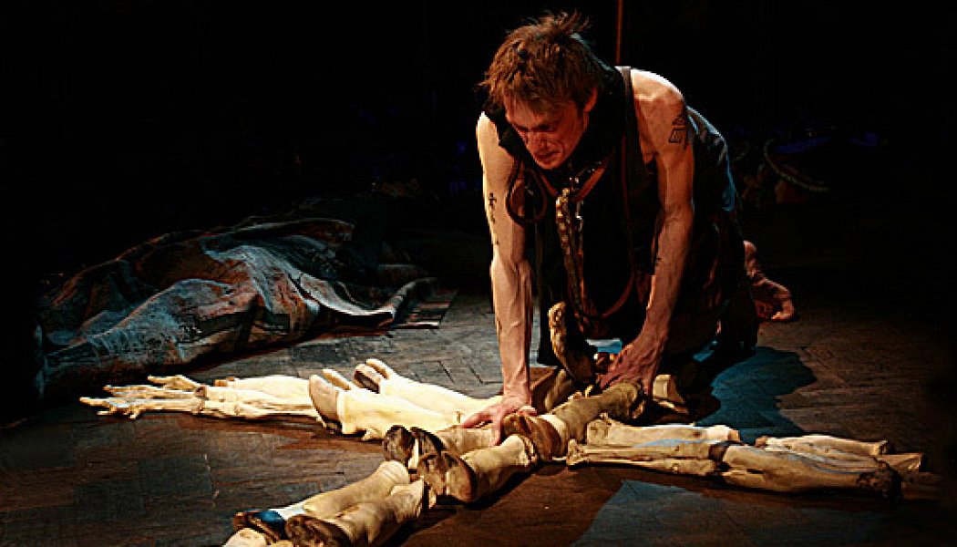 В «Гамлете» датский трон — это племя похотливых обезьян, уродующих «джоконд» — портреты да Винчи, символы красоты, которыми Коляда населяет всю сцену. Для Гамлета вопрос заключается в том, взять ли власть над этим племенем и самому стать зверем — или, оставаясь человеком, стать рабом зверя на коротком поводке.