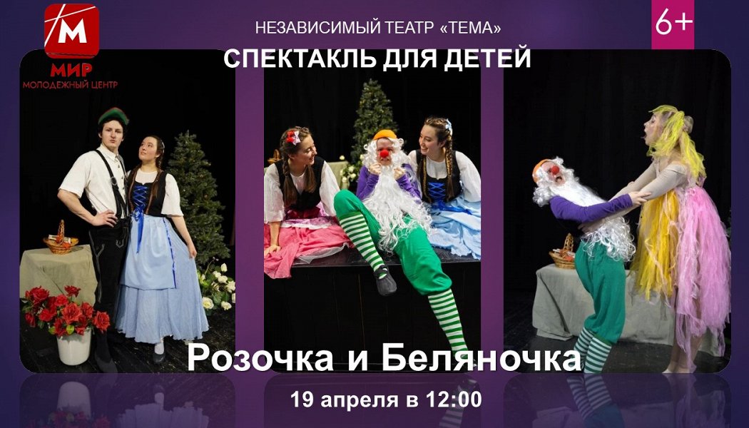 Молодежный центр "МИР" и театр «Тема» приглашают маленьких зрителей и их родителей в удивительное путешествие по волшебному миру братьев Гримм! На сцене оживёт немецкая сказка, известная по сборнику «Детские и домашние сказки» братьев Гримм. Вы познакомитесь с семьёй доброй вдовы, что живёт на краю леса, и её замечательными дочками - Розочкой и Беляночкой. Девочки ухаживают за прелестным садом, где красные и белые розы растут бок о бок, помогают маме, играют, танцуют и... однажды встречают загадочного зверя. Все вокруг его боятся, но он оказывается добрым, смелым и становится настоящим другом. А вот забавные гномы окажутся не такими уж примерными, как в сказках - и нашим сестрёнкам снова придётся помогать всем, кто нуждается в поддержке. Ведь за доброту всегда приходит награда.