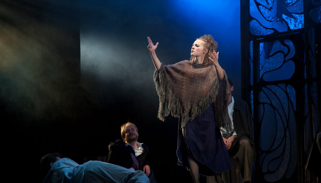 До сих пор «На дне» – самая известная пьеса Горького. В интерпретации з.д.и. России Юрия Томошевского она еще и актуальна. Режиссер увидел в пьесе универсальный сюжет, который может повториться и в наши дни. Но название спектакля – «Шестикрылый серафим», подсказанное пушкинским «Пророком», говорит о большем. Оформление сцены, придуманное великолепным мастером Ириной Михайловной Бируля, – ажурное, прозрачное, светящееся, – если присмотреться, состоит из разбитых оконных рам и осколков «стекла». И все же над ним парит ангел. Высвеченный лучом света, он осеняет это сотканное из воздуха пространство.