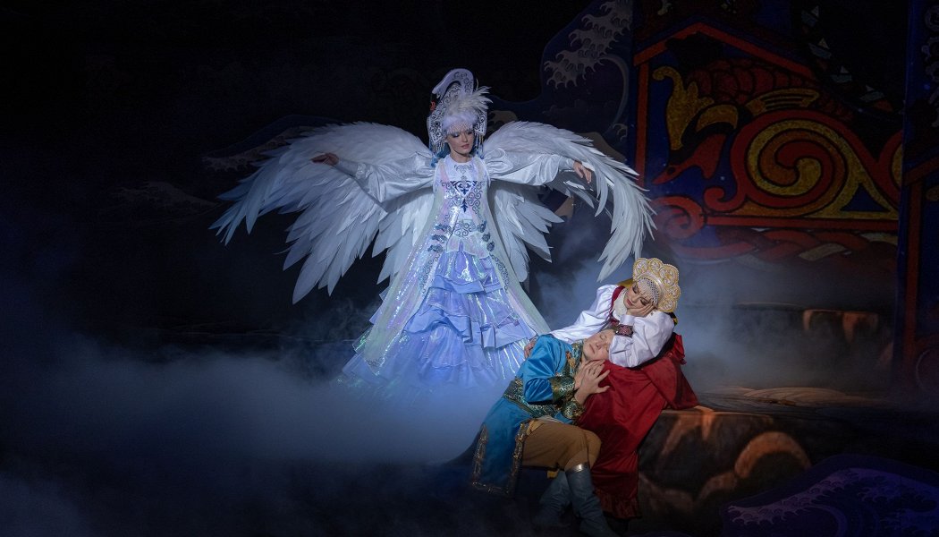 -Идеально вписавшуюся в сказку мелодию «Улетай на крыльях ветра» Бородина из оперы Князь Игорь в исполнении Царевны Лебедь (Карина Балашова)