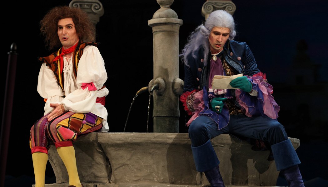Им обоим подворачивается неунывающий плут Труффальдино, которого они сразу нанимают к себе в слуги. Желая заработать как можно больше денег, Труффальдино удается скрывать от господ свою двойную службу и делать все, чтобы его хозяева не встретились. Однако постоянная путаница чемоданов, костюмов и писем, возникающая из-за излишней расторопности слуги, чуть не превращает веселую забаву с прятками и переодеваниями в трагедию.