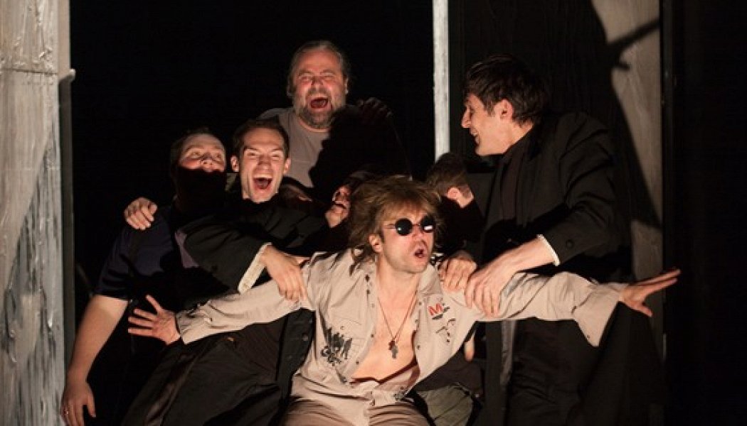 «Смерть Тарелкина» — третья часть трилогии, и, чтобы прояснить, почему с первых слов Тарелкин вопит «Не хочу жить!», Казанцев начинает спектакль последними сценами из «Дела»: крупный чиновник измывается над стариком Муромским, чиновник ниже рангом Тарелкин рассчитывает на этом нагреть руки. Но Муромский умирает — прямо здесь, в приемной, — а Тарелкин остается в дураках. Тогда, не желая мириться с неудачей, он затевает авантюру — инсценирует свою смерть и превращается в «беспаспортного вуйдалака». На сцене беснуется очаровательно идиотская компания оборотней в мундирах: большеротый горлопан, вертлявый хлюпик, верзила с инфернальной вкрадчивой пластикой и красная девица, по ошибке родившаяся в штанах (Денис Ясик, Тимофей Трибунцев, Сергей Епишев, Илья Ильин, взявшие за актерскую задачу «Ирода переиродить»). В центре композиции Тарелкин — молодой трагик Малого театра Глеб Подгородинский. Когда он играл в Малом Чацкого, его сравнивали с Олегом Меньшиковым, но, право, его нынешний монолог на смерть Тарелкина сделал бы Меньшикову честь.