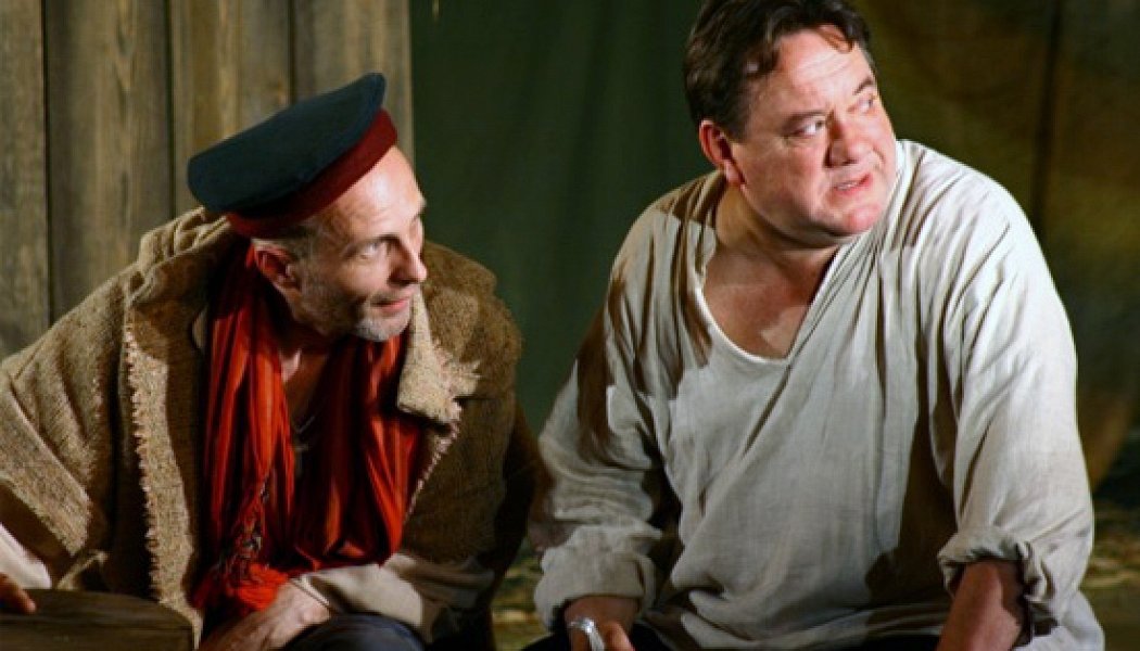 История эта знакома каждому со школьной скамьи: сельский богач Герасим Никодимович Калитка (его играет Богдан Бенюк) по жадности своей покупает 100 тысяч фальшивых рублей за 5 тысяч подлинных и получает в результате набитую нарезанной бумагой «куклу», да еще и теряет все свои земли. В Театре на Подоле «100 тысяч» из комедии о жадном помещике превратился в драму о крепком хозяйственнике, более всего любящем вовсе не деньги, а землю.