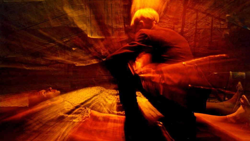 Декорации представляют собой угол изрисованной, исписанной, запачканной стены, уходящей в перспективе влево и вправо в Небытие. Откуда-то звучит, растворяясь в пустоте, "Утомлённое солнце", исполняемое Боцманом Бобом (персонаж из их спектакля "Омега"). Слева медленно танцует пара - девушка и военный. И тоже пропадает во мраке. Это некий пролог. Романс исполняется явно НЕживым существом: среда существования мертва за поворотом за угол. А люди ( словно с пустыми лицами) медленно кружатся в вальсе - "Страна моя погибла, а люди остались". И тут открывается словно второй план, который я бы назвал как "ПЛАЧ", мечта о той самой Утопии. Слышно пение птиц. Волей-неволей это напоминает отголоски Рая, подобному тому, который "рисовал" Венечка Ерофеев о Петушках ("это место, где не умолкают птицы, ни днём, ни ночью, где ни зимой, ни летом не отцветает жасмин"). И вот - ровно, словно маршируя, выходят спиной вперëд из Небытия Двое бритых. Один в чëрном - похожий на человека. Второй в белом - утративший человеческий облик. Для меня отсчётом "ПЛАЧА" является сцена болезненного отсоединения одного от другого. С этого момента ни похожий на человека ни второй НИКОГДА уже не соединятся. В целом, хочется отметить, что эффект невозможности достижения Утопии строится в спектакле на тотальном НЕвзаимодейсвии двух субъектов или неполном их взаимодействии. И ближе к финалу, да и в самом финале, это видно наиболее ярко. НЕВОЗМОЖНО Утопию УБИТЬ, но и ДОСТИЧЬ еë тоже НЕВОЗМОЖНО. Так, Бритый в чëрном так и не зарубит топором огромного ребëнка с выпавшими глазами... И уже потом, встретив "андрогина" (назовëм его как раз Утопией) в неподвижной маске и чëрном пиджаке, как бы он ни старался вторить его движениям, как бы он не боготворил его, боясь даже прикоснуться к нему в луче света с неба, всë равно воссоединение с ней (Утопией) невозможно. И, разделившись однажды, разойдясь в разные стороны угла этой стены, Бритый в чëрном закружится в порыве ветра навсегда, а Утопия так и будет недосягаема, где-то там, за углом, где когда-то растворялся в пустоте романс "Утомлённое солнце".