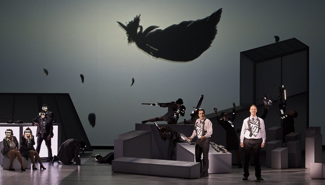 такое впечатление, что историзм пытается соблюдать только оперетта, а опера и обычный драмтеатр как "серьезные" жанры экспериментируют с постмодерном. в данном случае они сделали рамочный нарратив для сюжета оперы, перенеся все действие в современную компанию по производству компьютерных игр и разыгрывая основную оперу как игру, по сути как постановку в постановке. каспар тем не менее, после окончания игры, "внезапно перешел на другую работу", да и у макса с агатой начались отношения. выглядит это порой довольно забавно - охота на компьютерных птеродактилей на экране, футуристические бластеры вместо охотничьих ружей, пиджаки главных героев, деловые костюмы женщин (которые они потом впрочем меняют), всякие блестяшки и светяшки у действующих лиц, ну и особенно демоны - прямо герои компьютерной игры - в отличных костюмах, с сегментированными хвостами, головами как у чужого, на ходулях, напоминающих беговые протезы (!), полный отпад в общем. может показаться что все плохо, но пели все отлично и оркестр играл тоже отлично, полный улет, я был в восторге, наконец-то нормальный вокал без пережеванных усилком частот, так хочется чтобы оперетты сейчас тоже без микрофонов пели... оперные девочки немного толстенькие (: но не все. были и старинные костюмы, что-то вроде плащей и тирольских шляп у мужчин, многослойные юбки как для канкана и странные головные уборы, напоминающие уши микки-мауса (немецкий кокошник?) у женщин, белое платье агаты и т.д. девушки в многослойных платьях попытались изобразить недоканкан, а потом в качестве тяжелой артиллерии повернулись и дружно нагнулись показав трусы, было смешно, а так в принципе все прилично. мне понравились как анхен пшикала на агату водой из распылителя, у них вообще был очень милый дуэт