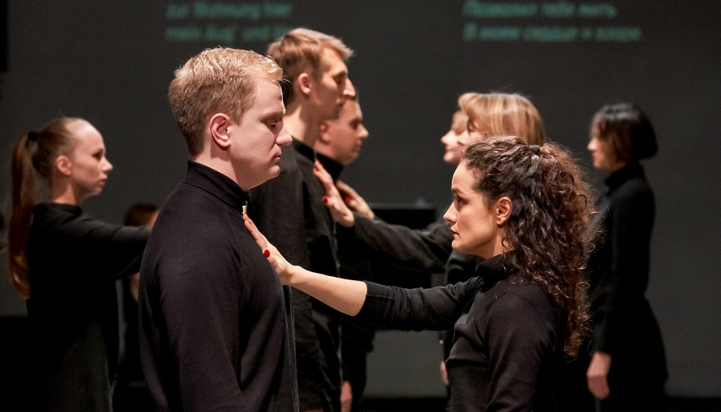 «Закрой мне глаза» – это первая строчка из песни Альбана Берга «Schließe mir die Augen beide», которая звучит в спектакле наряду с песнями Шуберта, Малера, Пуленка, Дюпарка и других. Но это еще и призыв доверять друг другу, отправиться в неизведанное пространство с закрытыми глазами.