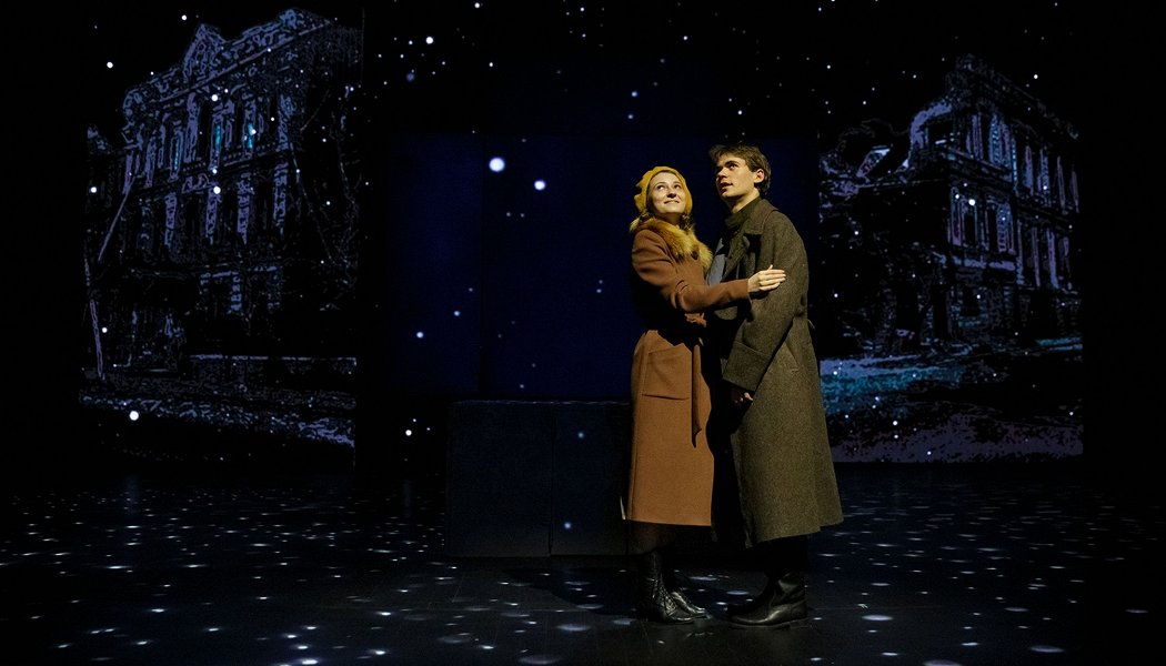 Декорации, созданные Павлом Курочкиным, Кириллом Даниловым, Яниной Кремер и Евгением Лисицыным, формируют выразительное монохромное пространство, которое время от времени разрывают красные всполохи — будто напоминание о войне и о чувствах, которые горят даже в самые тёмные времена. Огромное звёздное небо над сценой становится символом быстротечности счастья — и того, что оно всё же оставляет след.