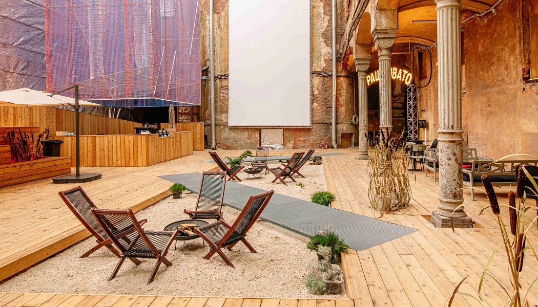 Во внутреннем дворе особняка с богатой историей сегодня располагается калифорнийский пляж с горящими кострами, золотым песком и шезлонгами. По выходным здесь проходят вечеринки под открытым небом, на которых ценители актуального искусства могут насладиться концептуальным звучанием и специально созданным для пространства видеоартом на большом экране, а также подборкой авторского кино. В летний сезон во дворе выставляются работы современных художников — как молодых и начинающих, так и уже известных широкой публике.
